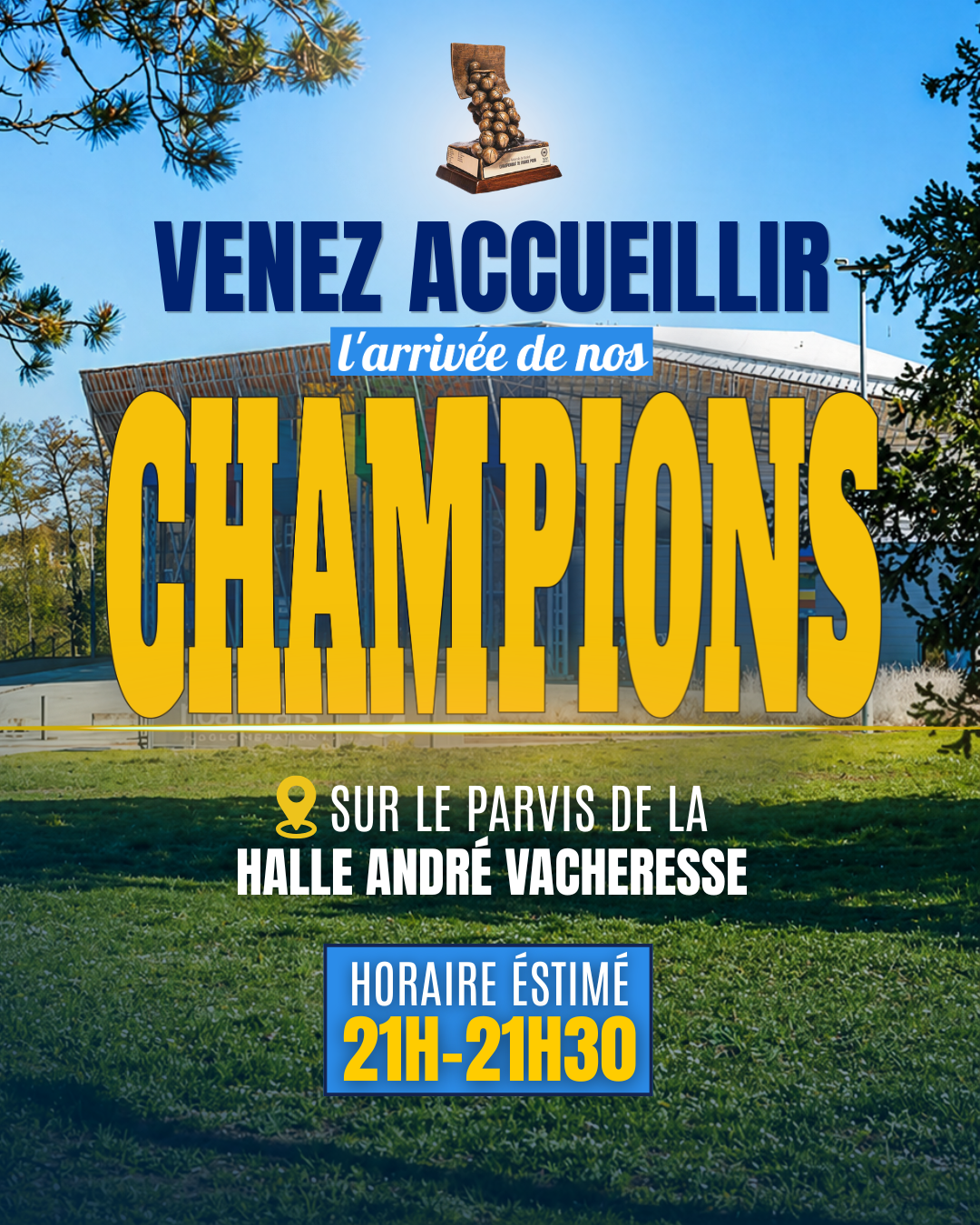Venez féliciter nos champions sur le parvis de la Halle André Vacheresse ce dimanche 26 avril dès leur arrivée, entre 21h et 21h30 💙